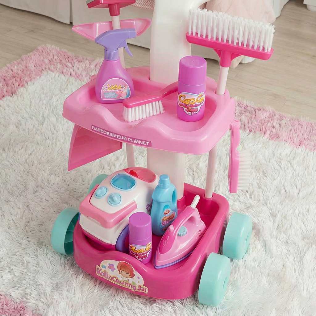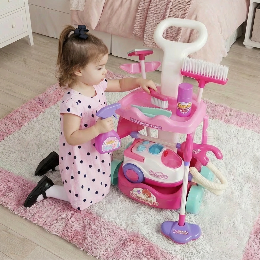 - Complete play set with broom, mop, dustpan, brush, and cleaning accessories