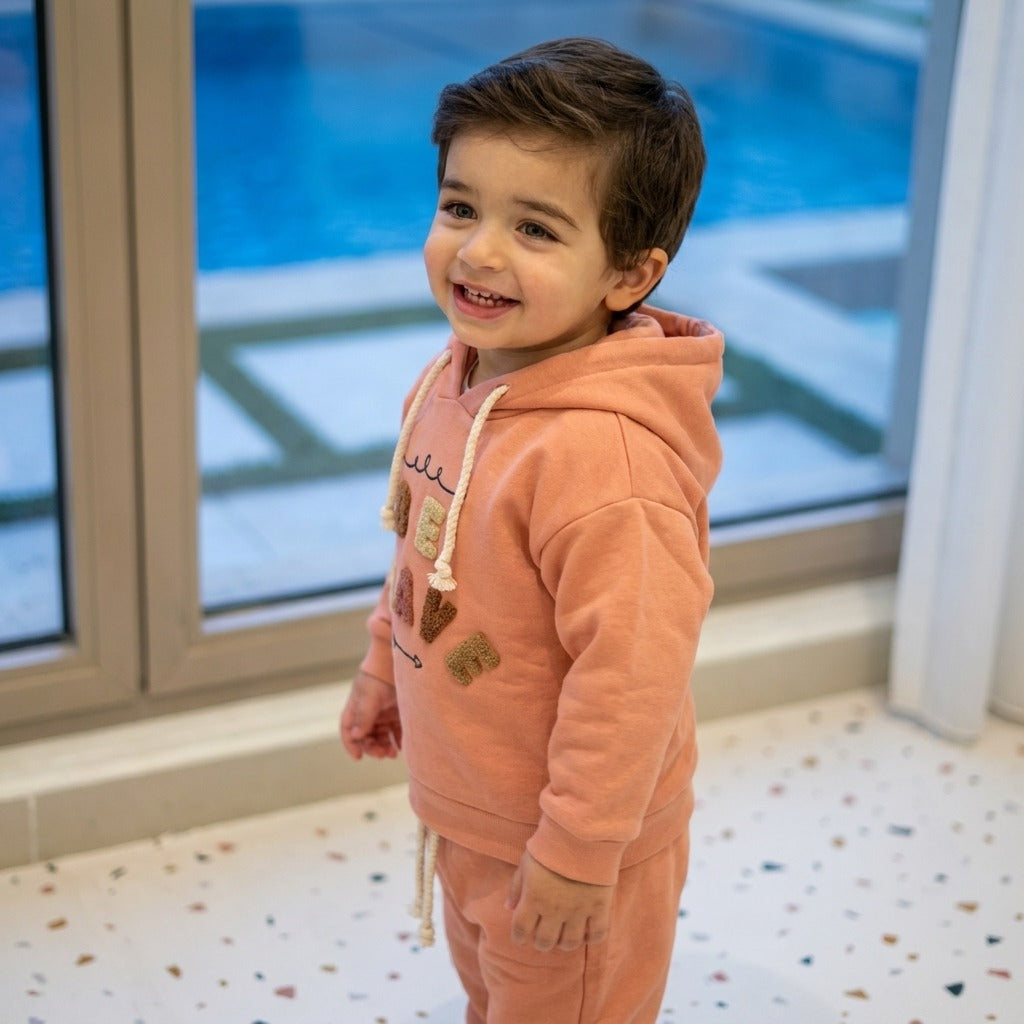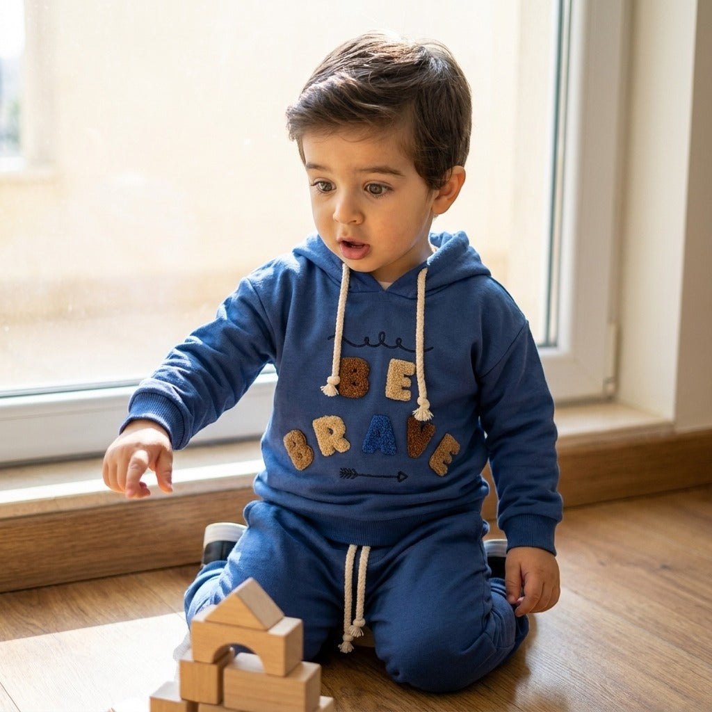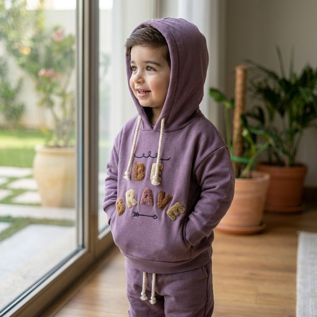 - Cozy hoodie and jogger set with a bold "Be Brave" embroidered lettering