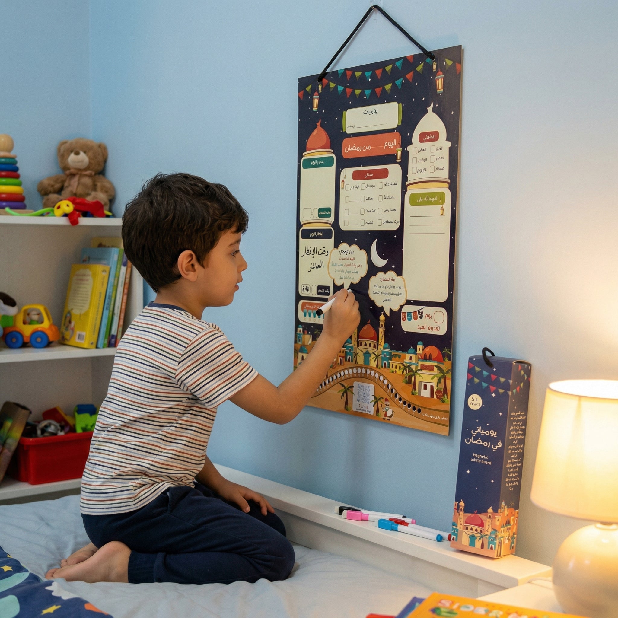 يومياتي في رمضان لوح مغناطيسي قابل للمسح يساعد الأطفال على متابعة الصلاة والصيام، التخطيط للإفطار والسحور، وبناء عادات إيمانية إيجابية.