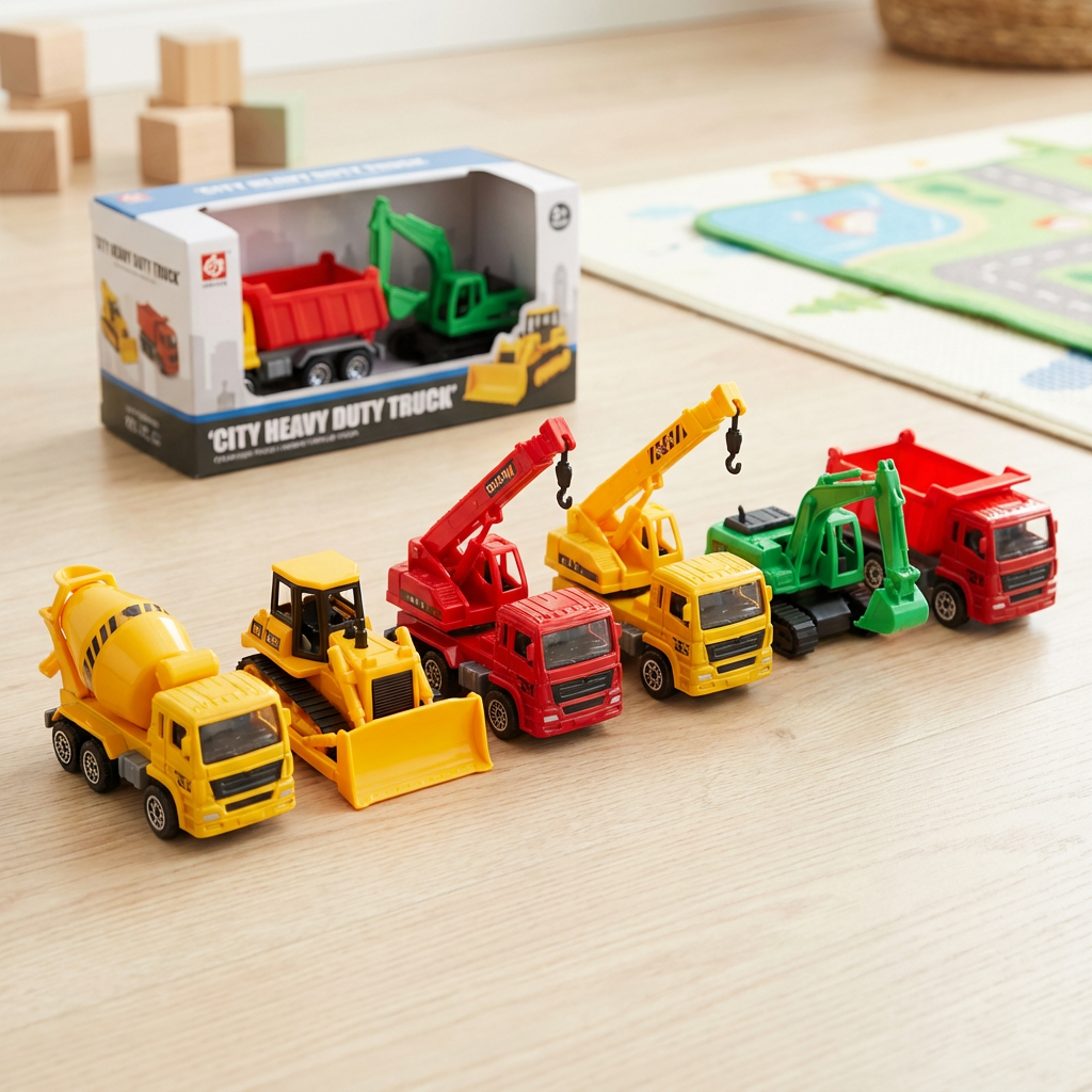 - Set includes 6 different trucks: dump truck, cement mixer, bulldozer, excavator, crane, tanker